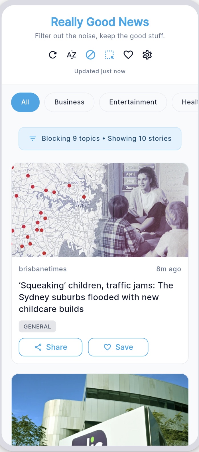 Really Good News is a news app that lets you block certain names and words from your news feed. For example, you can block all Kardashian news or all Trump news if you want. Conversely, you can make the app search for Kardashian or Trump news, if that is your bag. Coming soon, almost done!