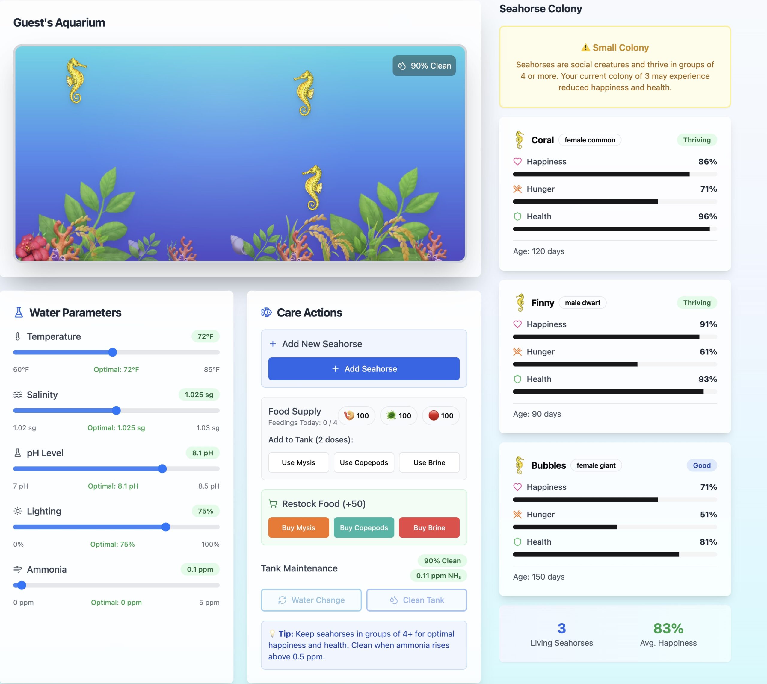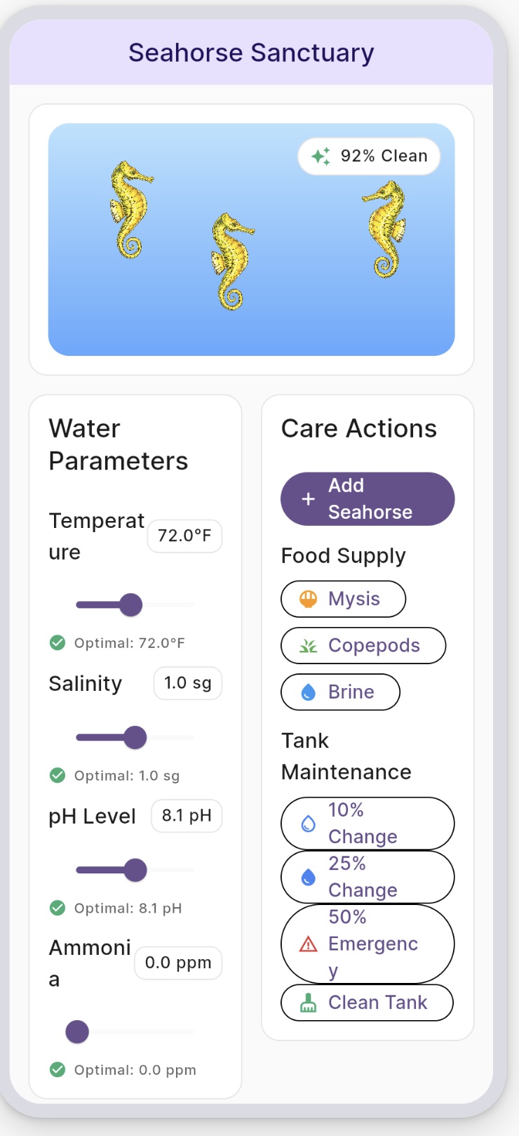 This is the iPhone version of Seahorse Sanctuary. It’s still under production but again, it should be ready by the end of November, 2025. This differs from the web version in that the fish are much touchier and the parameters are stricter. All you have to do to have happy seahorses is structure your entire life around a SIM game and all will be well! Coming soon, almost done!